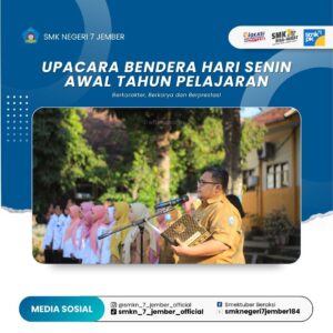 Kepala SMKN 7 Jember, Bapak Nanda Wiratama MF, S.Pd., M.Pd dalam amanatnya menyampaikan pesan penting tentang pentingnya membangun karakter yang baik untuk menggapai cita-cita. Beliau menekankan semangat “Smektuber Beraksi, SMKN 7 Jember Berkarakter, Berkarya, Berprestasi” sebagai landasan bagi para siswa untuk meraih kesuksesan.