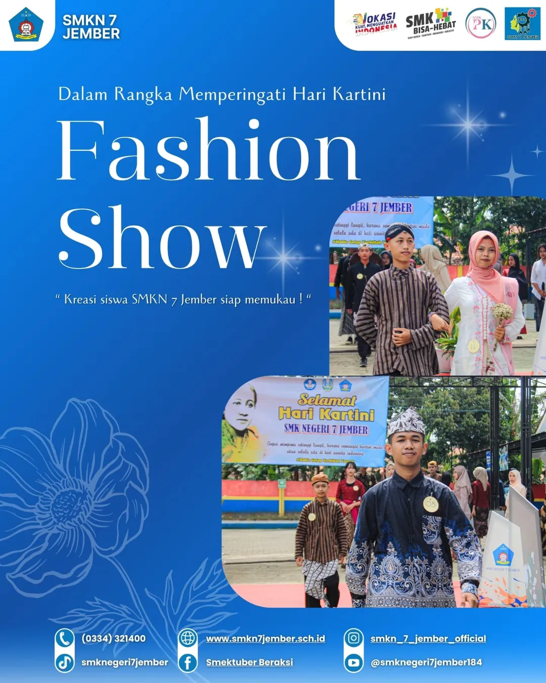 Fashion show yang diadakan di aula sekolah ini menampilkan beragam busana adat tradisional hingga kreasi modern yang terinspirasi dari nilai-nilai perjuangan Raden Ajeng Kartini. Para peserta, yang merupakan siswa-siswi SMKN 7 Jember, berjalan anggun di atas panggung, menunjukkan bakat dan percaya diri mereka.