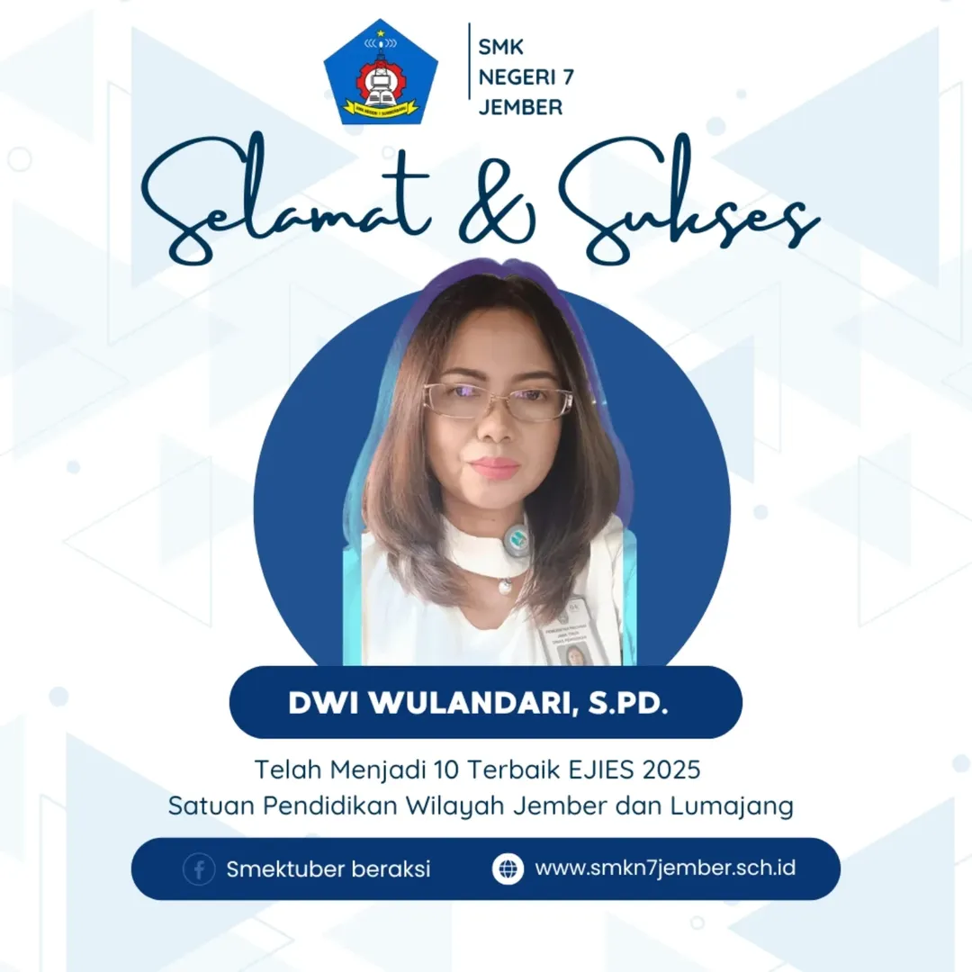“Selamat dan sukses telah menjadi 10 terbaik EJIES 2025 satuan pendidikan wilayah Jember!” demikian ucapan selamat yang disampaikan kepada seluruh elemen sekolah. Prestasi ini menegaskan posisi SMKN 7 Jember sebagai salah satu sekolah kejuruan unggulan yang mampu bersaing dan menghasilkan lulusan berkualitas.