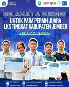 Jember – Prestasi membanggakan kembali diraih oleh siswa-siswi SMK Negeri 7 Jember dalam ajang LKS DIKMEN 2026 (Lomba Kompetensi Siswa Pendidikan Menengah) Tingkat Kabupaten Jember. Para peserta berhasil menunjukkan kompetensi terbaiknya di berbagai bidang lomba dan mengharumkan nama sekolah di tingkat kabupaten.
