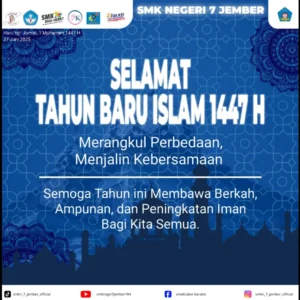 Jember,26 juni 2025 – Keluarga besar SMKN 7 Jember dengan penuh suka cita menyambut datangnya Tahun Baru Islam 1447 Hijriah. Peringatan momen istimewa ini menjadi kesempatan bagi seluruh warga sekolah untuk merefleksikan diri, mempererat tali silaturahmi, dan menumbuhkan semangat kebersamaan dalam bingkai keberagaman. Mengusung tema “Merangkul Perbedaan, Menjalin Kebersamaan”, SMKN 7 Jember mengajak seluruh civitas […]