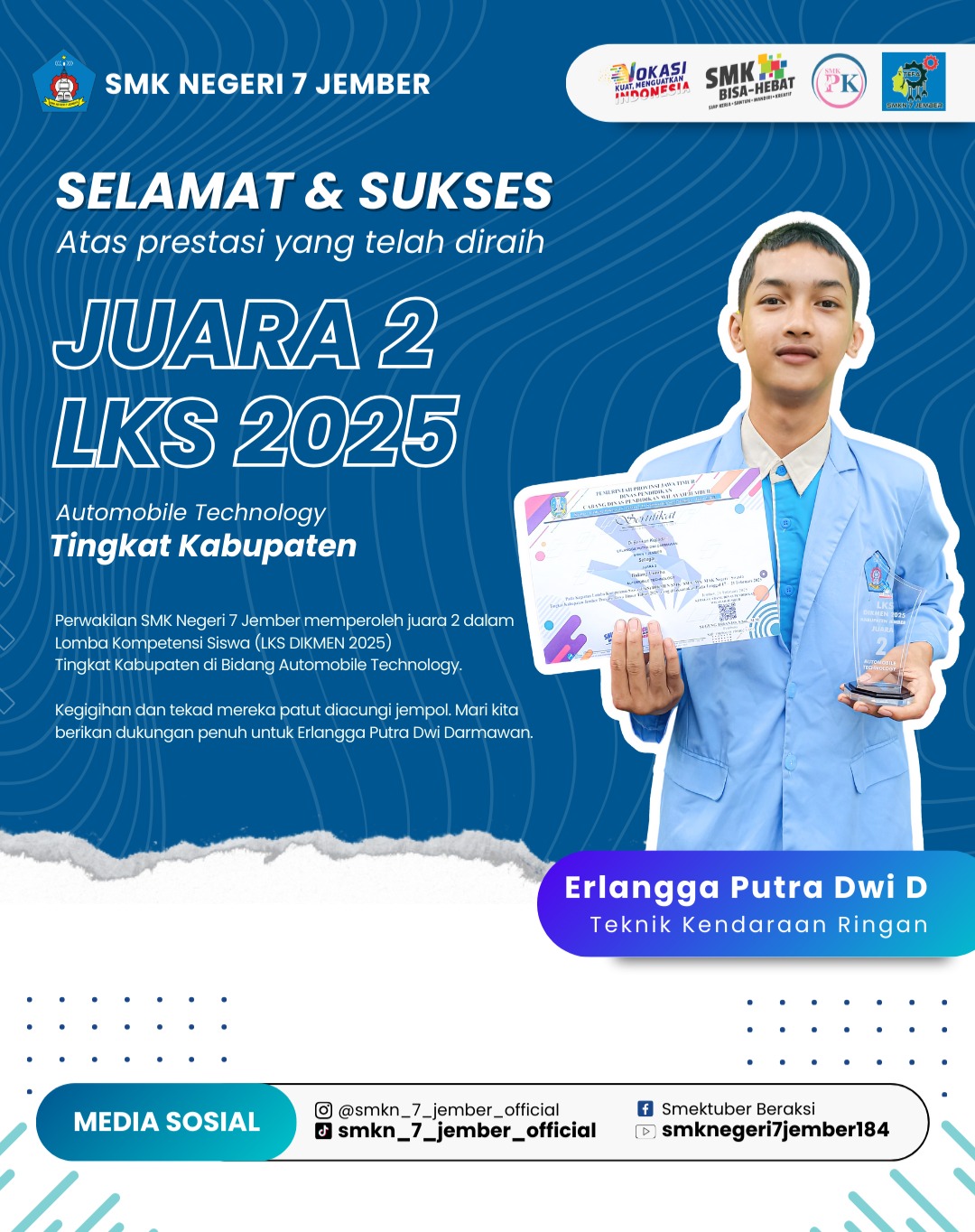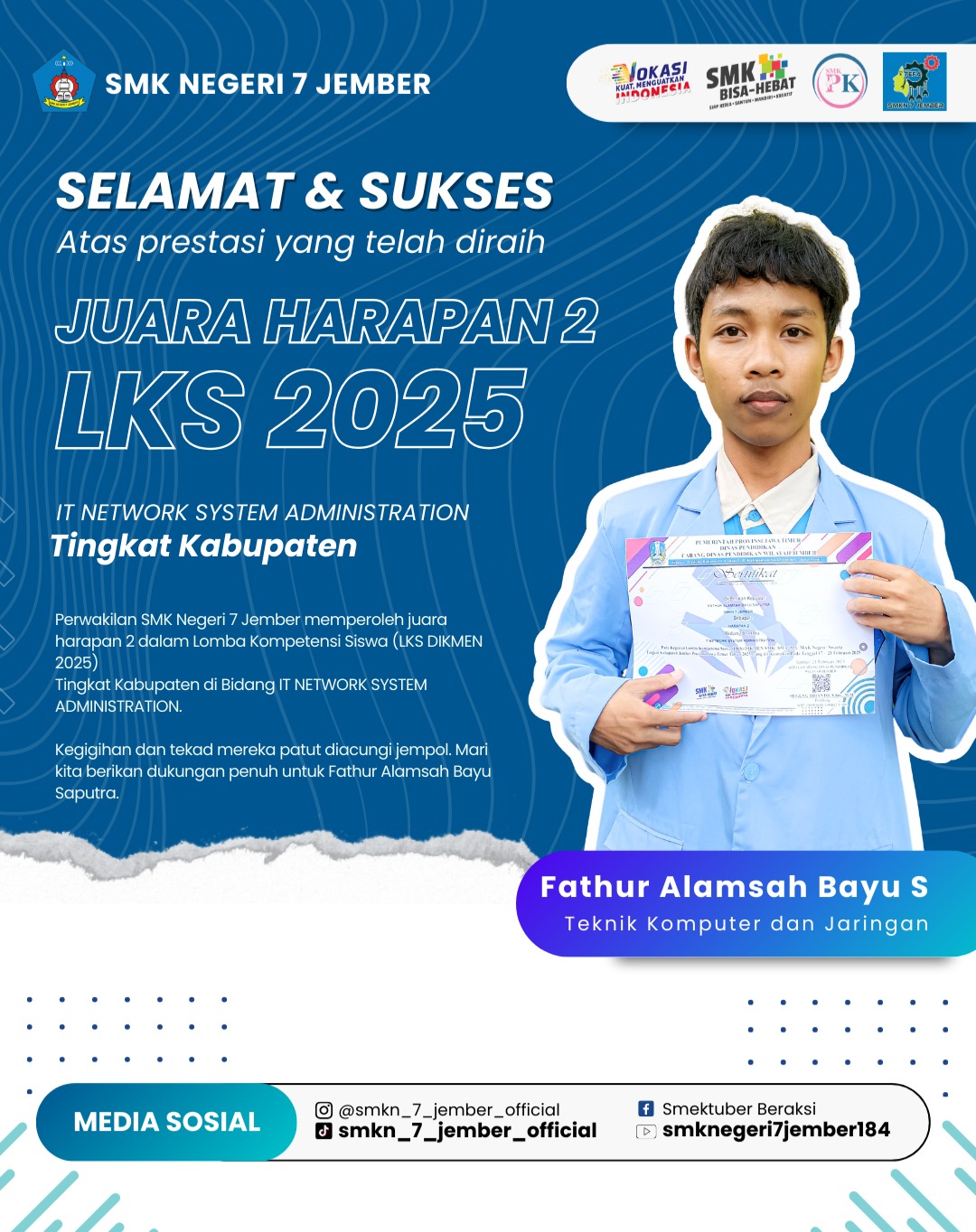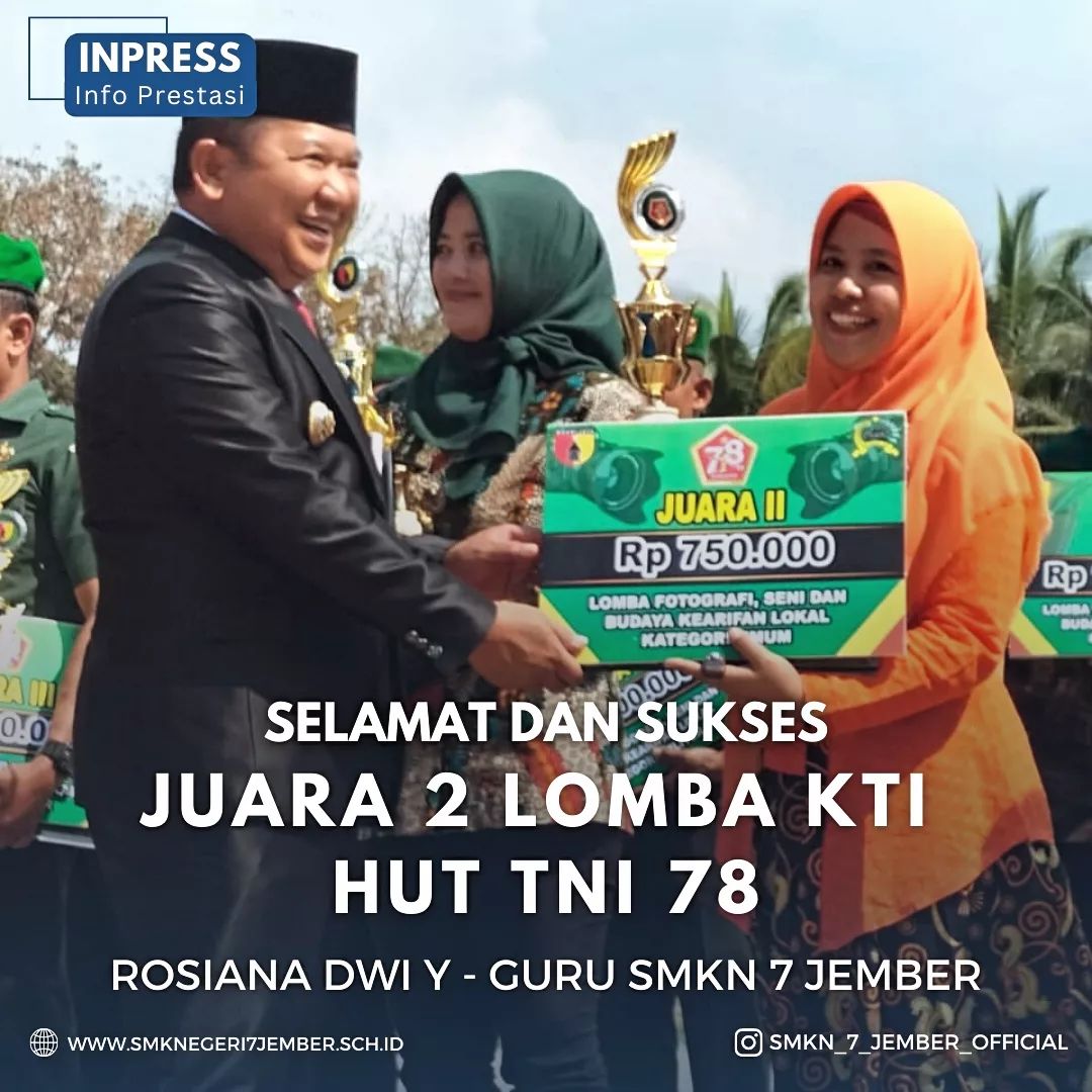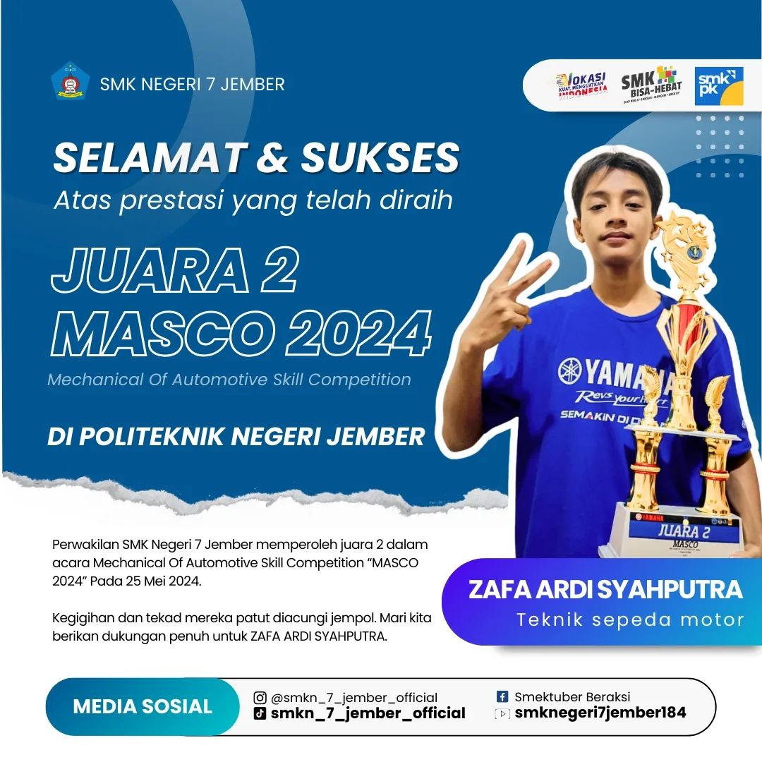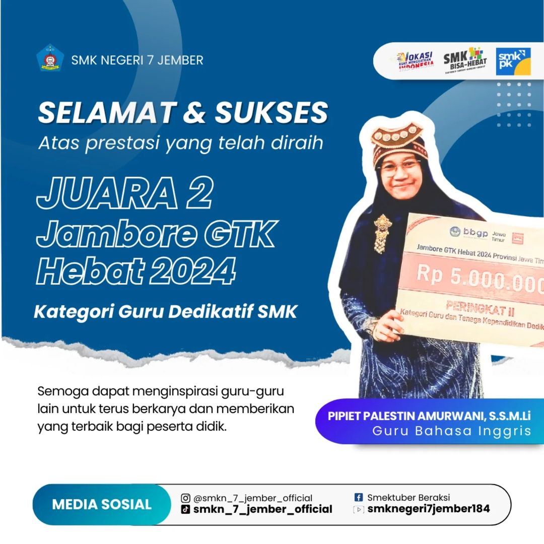 Prestasi Finalis Terpopuler di Lomba Puisi MGMP Bahasa Indonesia Kabupaten Jember Juara 1 Bidang Lomba Beauty Therapy Tingkat Kabupaten Jember Juara 1 Bidang Lomba Motorcycle Repair and Maintenance Tingkat Kabupaten Jember JUARA 1 TANDING KELAS CHAMPIONSHIP 3 Juara 2 Bidang Lomba Automobile Technology Tingkat Kabupaten Jember JUARA 2 JAMBORE GTK HEBAT 2024 Juara 2 Lomba KTI HUT TNI 78 JUARA 2 MASCO 2024 DI POLIJE Juara 3 Galaksi ( Guru dan Kepala Sekolah Berprestasi) Kabupaten Jember 2023 Juara 3 Tanding Kelas C (47kg - 51kg) Putri Tingkat Remaja di Jember Championship 2 Juara Harapan 2 Bidang Lomba IT Network System Administration Tingkat Kabupaten Jember Juara III Lomba Karya Jurnalistik dalam rangka Hari Pers Nasional dan HUT PWI ke 77